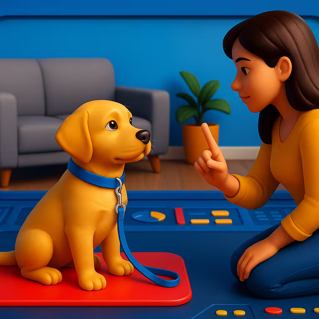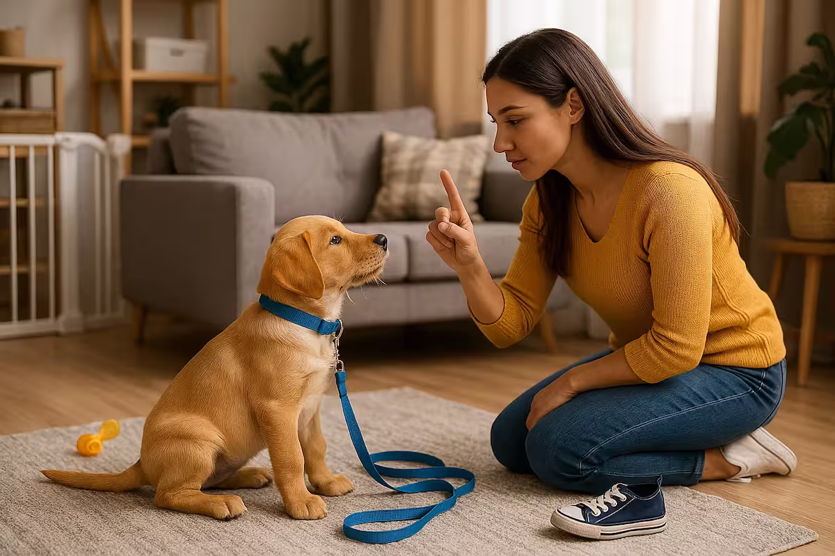 An illustrated scene of a trainer teaching a young golden puppy to stay, seated calmly on a rug indoors. The trainer gestures with a hand signal, while warm light fills the room, evoking peace and trust. This image supports the article Teaching Your Puppy to Stay. An illustrated scene of a trainer teaching a young golden puppy to stay, seated calmly on a rug indoors. The trainer gestures with a hand signal, while warm light fills the room, evoking peace and trust. This image supports the article Teaching Your Puppy to Stay.